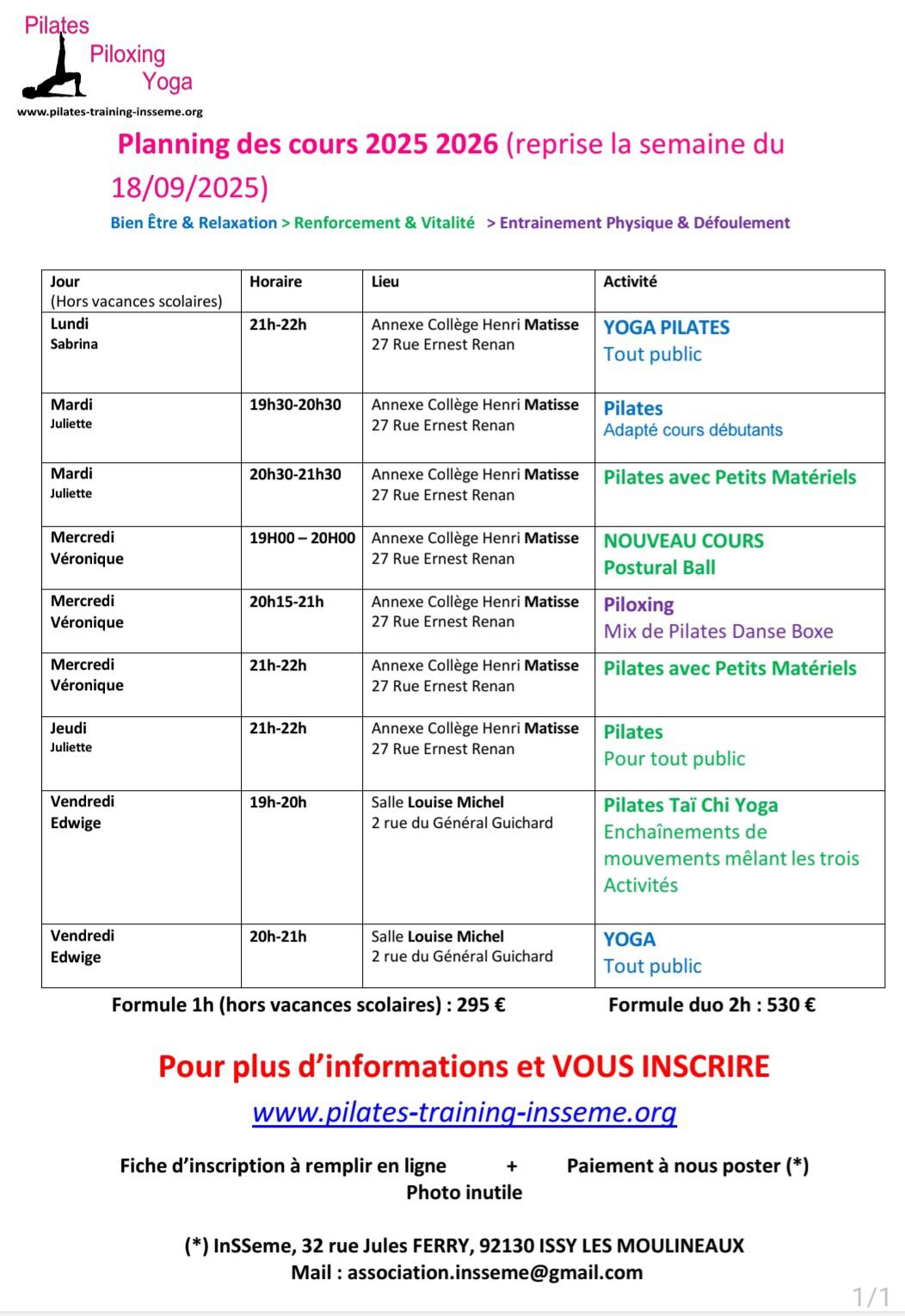 Annexe Collège Henri Matisse, 27 rue Ernest Renan : mercredi 19h00 / 20h00 par notre Instructrice, Véronique.